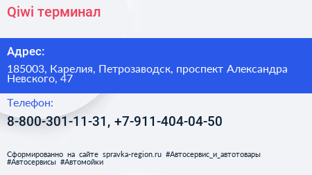 Qiwi, терминал по адресу 185003, Карелия, Петрозаводск, проспект Александра Невского, 47 в дальнейшем Организация, размещена в следующих категориях: