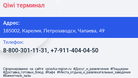 Qiwi, терминал по адресу 185002, Карелия, Петрозаводск, Чапаева, 49 в дальнейшем Организация, размещена в следующих категориях: