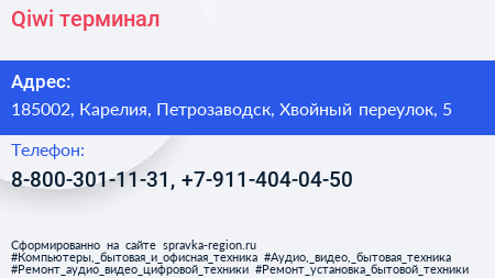 Qiwi, терминал по адресу 185002, Карелия, Петрозаводск, Хвойный переулок, 5 в дальнейшем Организация, размещена в следующих категориях: