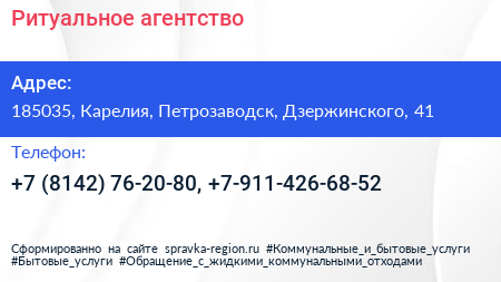 Ритуальное агентство по адресу 185035, Карелия, Петрозаводск, Дзержинского, 41 в дальнейшем Организация, размещена в следующих категориях: