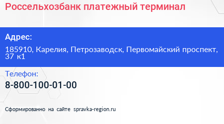 Россельхозбанк, платежный терминал по адресу 185910, Карелия, Петрозаводск, Первомайский проспект, 37 к1 в дальнейшем Организация, размещена в следующих категориях:
