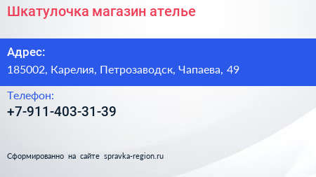 Шкатулочка, магазин-ателье по адресу 185002, Карелия, Петрозаводск, Чапаева, 49 в дальнейшем Организация, размещена в следующих категориях: