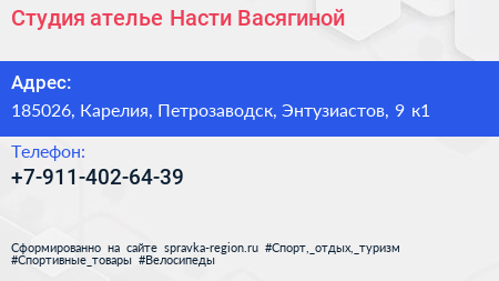 Студия-ателье Насти Васягиной по адресу 185026, Карелия, Петрозаводск, Энтузиастов, 9 к1 в дальнейшем Организация, размещена в следующих категориях: