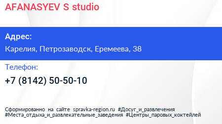 AFANASYEV`S studio по адресу Карелия, Петрозаводск, Еремеева, 38 в дальнейшем Организация, размещена в следующих категориях: