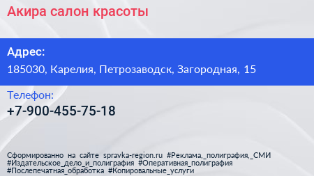 Акира, салон красоты по адресу 185030, Карелия, Петрозаводск, Загородная, 15 в дальнейшем Организация, размещена в следующих категориях: