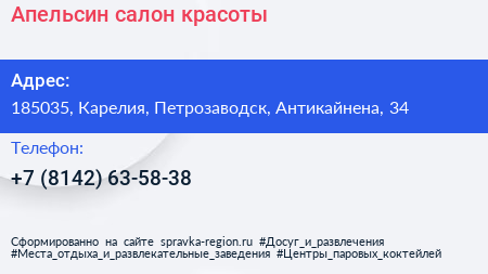Апельсин, салон красоты по адресу 185035, Карелия, Петрозаводск, Антикайнена, 34 в дальнейшем Организация, размещена в следующих категориях: