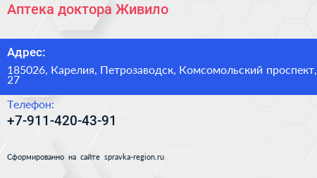 Аптека доктора Живило по адресу 185026, Карелия, Петрозаводск, Комсомольский проспект, 27 в дальнейшем Организация, размещена в следующих категориях: