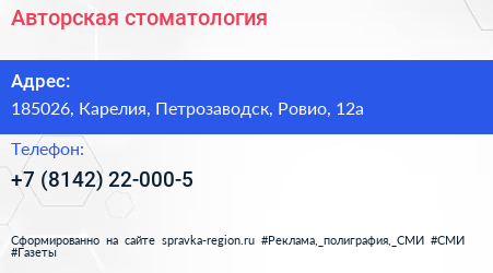 Авторская стоматология по адресу 185026, Карелия, Петрозаводск, Ровио, 12а в дальнейшем Организация, размещена в следующих категориях: