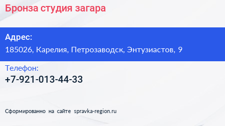 Бронза, студия загара по адресу 185026, Карелия, Петрозаводск, Энтузиастов, 9 в дальнейшем Организация, размещена в следующих категориях: