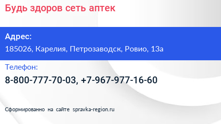 Будь здоров!, сеть аптек по адресу 185026, Карелия, Петрозаводск, Ровио, 13а в дальнейшем Организация, размещена в следующих категориях: