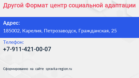 Другой Формат, центр социальной адаптации по адресу 185002, Карелия, Петрозаводск, Гражданская, 25 в дальнейшем Организация, размещена в следующих категориях: