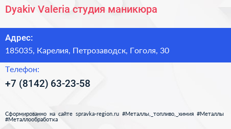 Dyakiv Valeria, студия маникюра по адресу 185035, Карелия, Петрозаводск, Гоголя, 30 в дальнейшем Организация, размещена в следующих категориях:
