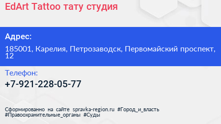 EdArt Tattoo, тату-студия по адресу 185001, Карелия, Петрозаводск, Первомайский проспект, 12 в дальнейшем Организация, размещена в следующих категориях: