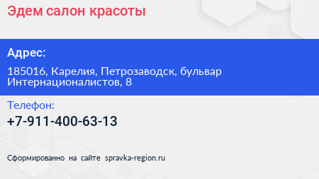 Эдем, салон красоты по адресу 185016, Карелия, Петрозаводск, бульвар Интернационалистов, 8 в дальнейшем Организация, размещена в следующих категориях: