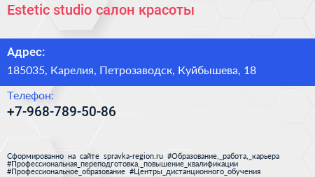 Estetic studio, салон красоты по адресу 185035, Карелия, Петрозаводск, Куйбышева, 18 в дальнейшем Организация, размещена в следующих категориях: