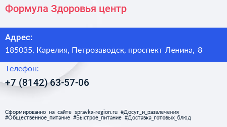 Формула Здоровья, центр по адресу 185035, Карелия, Петрозаводск, проспект Ленина, 8 в дальнейшем Организация, размещена в следующих категориях: