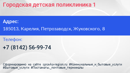 Городская детская поликлиника №1 по адресу 185013, Карелия, Петрозаводск, Жуковского, 8 в дальнейшем Организация, размещена в следующих категориях: