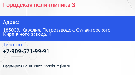 Городская поликлиника №3 по адресу 185009, Карелия, Петрозаводск, Сулажгорского Кирпичного завода, 4 в дальнейшем Организация, размещена в следующих категориях:
