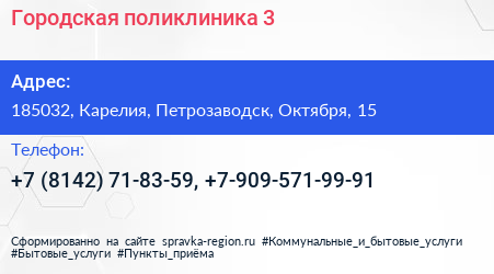 Городская поликлиника №3 по адресу 185032, Карелия, Петрозаводск, Октября, 15 в дальнейшем Организация, размещена в следующих категориях: