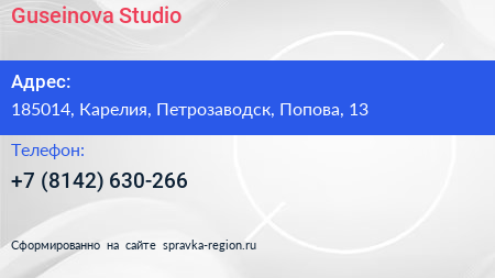 Guseinova Studio по адресу 185014, Карелия, Петрозаводск, Попова, 13 в дальнейшем Организация, размещена в следующих категориях:
