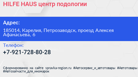 HILFE HAUS, центр подологии по адресу 185014, Карелия, Петрозаводск, проезд Алексея Афанасьева, 6 в дальнейшем Организация, размещена в следующих категориях: