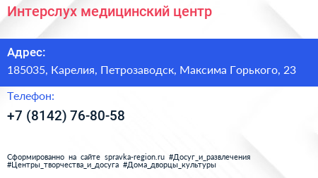 Интерслух, медицинский центр по адресу 185035, Карелия, Петрозаводск, Максима Горького, 23 в дальнейшем Организация, размещена в следующих категориях: