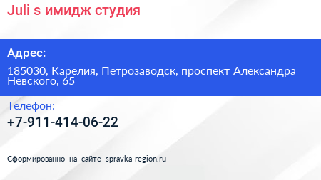 Juli`s, имидж-студия по адресу 185030, Карелия, Петрозаводск, проспект Александра Невского, 65 в дальнейшем Организация, размещена в следующих категориях: