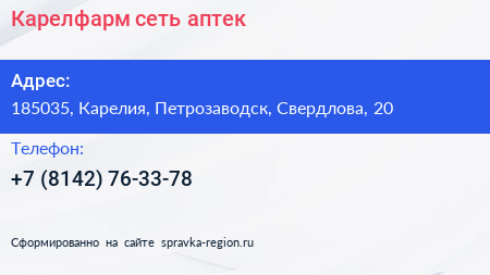 Карелфарм, сеть аптек по адресу 185035, Карелия, Петрозаводск, Свердлова, 20 в дальнейшем Организация, размещена в следующих категориях: