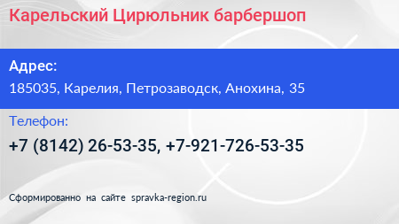 Карельский Цирюльник, барбершоп по адресу 185035, Карелия, Петрозаводск, Анохина, 35 в дальнейшем Организация, размещена в следующих категориях: