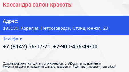 Кассандра, салон красоты по адресу 185030, Карелия, Петрозаводск, Станционная, 23 в дальнейшем Организация, размещена в следующих категориях: