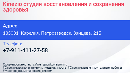 Kinezio, студия восстановления и сохранения здоровья по адресу 185031, Карелия, Петрозаводск, Зайцева, 21Б в дальнейшем Организация, размещена в следующих категориях: