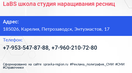 LaBS, школа-студия наращивания ресниц по адресу 185026, Карелия, Петрозаводск, Энтузиастов, 17 в дальнейшем Организация, размещена в следующих категориях: