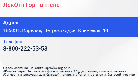 ЛекОптТорг, аптека по адресу 185034, Карелия, Петрозаводск, Ключевая, 14 в дальнейшем Организация, размещена в следующих категориях: