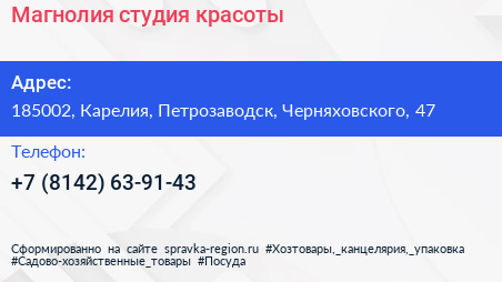 Магнолия, студия красоты по адресу 185002, Карелия, Петрозаводск, Черняховского, 47 в дальнейшем Организация, размещена в следующих категориях: