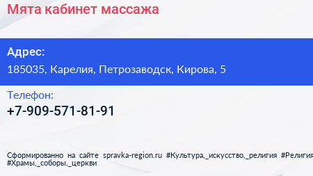 Мята, кабинет массажа по адресу 185035, Карелия, Петрозаводск, Кирова, 5 в дальнейшем Организация, размещена в следующих категориях:
