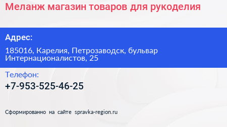 Меланж, магазин товаров для рукоделия по адресу 185016, Карелия, Петрозаводск, бульвар Интернационалистов, 25 в дальнейшем Организация, размещена в следующих категориях: