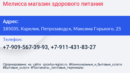 Мелисса, магазин здорового питания по адресу 185035, Карелия, Петрозаводск, Максима Горького, 25 в дальнейшем Организация, размещена в следующих категориях: