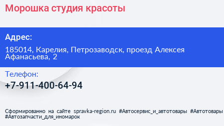 Морошка, студия красоты по адресу 185014, Карелия, Петрозаводск, проезд Алексея Афанасьева, 2 в дальнейшем Организация, размещена в следующих категориях: