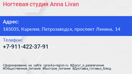 Ногтевая студия Anna Livan по адресу 185035, Карелия, Петрозаводск, проспект Ленина, 14 в дальнейшем Организация, размещена в следующих категориях: