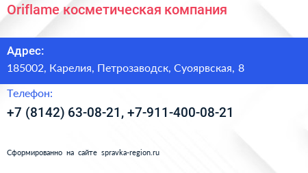Oriflame, косметическая компания по адресу 185002, Карелия, Петрозаводск, Суоярвская, 8 в дальнейшем Организация, размещена в следующих категориях: