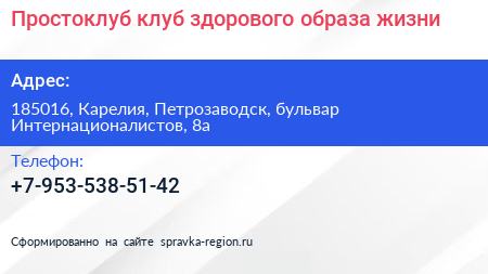 Простоклуб, клуб здорового образа жизни по адресу 185016, Карелия, Петрозаводск, бульвар Интернационалистов, 8а в дальнейшем Организация, размещена в следующих категориях: