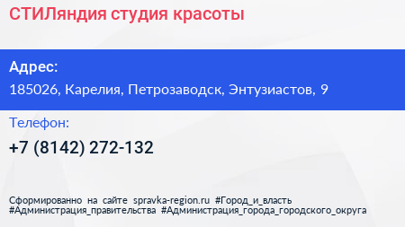 СТИЛяндия, студия красоты по адресу 185026, Карелия, Петрозаводск, Энтузиастов, 9 в дальнейшем Организация, размещена в следующих категориях: