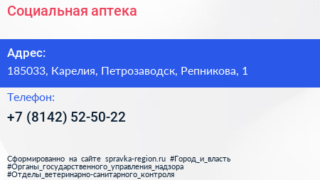 Социальная аптека по адресу 185033, Карелия, Петрозаводск, Репникова, 1 в дальнейшем Организация, размещена в следующих категориях: