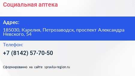 Социальная аптека по адресу 185030, Карелия, Петрозаводск, проспект Александра Невского, 54 в дальнейшем Организация, размещена в следующих категориях: