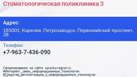 Стоматологическая поликлиника №3 по адресу 185001, Карелия, Петрозаводск, Первомайский проспект, 28 в дальнейшем Организация, размещена в следующих категориях: