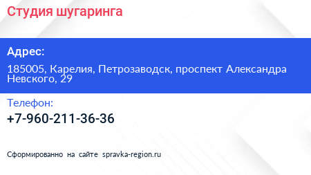 Студия шугаринга по адресу 185005, Карелия, Петрозаводск, проспект Александра Невского, 29 в дальнейшем Организация, размещена в следующих категориях: