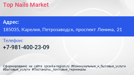 Top Nails Market по адресу 185035, Карелия, Петрозаводск, проспект Ленина, 21 в дальнейшем Организация, размещена в следующих категориях: