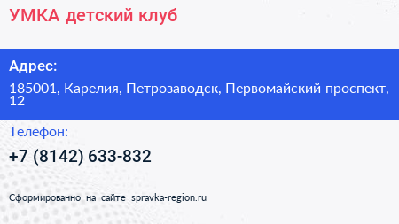 УМКА, детский клуб по адресу 185001, Карелия, Петрозаводск, Первомайский проспект, 12 в дальнейшем Организация, размещена в следующих категориях: