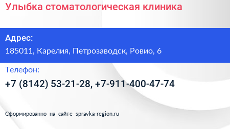 Улыбка, стоматологическая клиника по адресу 185011, Карелия, Петрозаводск, Ровио, 6 в дальнейшем Организация, размещена в следующих категориях: