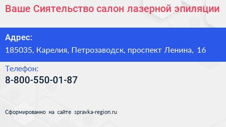 Ваше Сиятельство, салон лазерной эпиляции по адресу 185035, Карелия, Петрозаводск, проспект Ленина, 16 в дальнейшем Организация, размещена в следующих категориях: